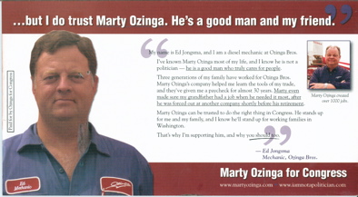 Ozinga continues to demonstrate that he is not a heartless businessman, (or as the anti-Ozinga reporters like to call him, a “mogul”, or a “magnate”, as though we still live in the Victorian Guilded Age). Instead Ozinga, and this flyer makes this point, has been demonstrating his compassion and the community support he has been giving charity in the 11th District over the past 30 years. Instead of falling into the Democrat’s stereotypical anti-businessman cartoon portrayal, Ozinga is showing that he cares about voters on a personal level, blunting this political attack.