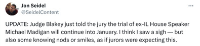 * Tribune | ‘Magic list’ of Madigan-connected lobbyists shown to jury in ex-speaker’s corruption trial: “So since I don’t roam the halls like I use to do I do not have the same ‘on site’ engagement that I use to have,” read the email, which was shown to jurors Monday in the corruption trial of Madigan and McClain. “A Friend of ours and myself have gone through the ‘magic list’ and frankly culled quite a few names…There are now a little less than two dozen on the list.” McClain went on to ask the recipient of the email for help fish for potential clients.