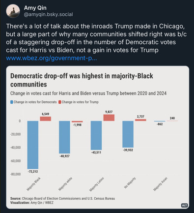 Take another look at the vote trends (including the item above under “elections”). The story of this election is the people who stayed home. Fewer people showed up to vote this year than in 2020 and the drop off for Biden-Harris was much bigger than for Trump. If Trump follows through on his promises, it will be the Dems to lose.