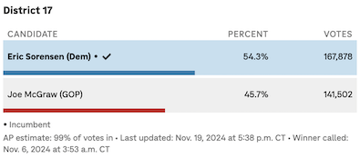 * Freshman incumbent Democrat Eric Sorensen increased his percentage to 54.3 from 51.98 in 2022…