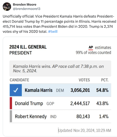 This goes against the narrative that more people in Illinois went for Trump. Tells me there were a whole lot of Democrats who either skipped over the presidential race or simply didn’t vote. I don’t think this election is telling Republicans in Illinois what they think it is telling them.