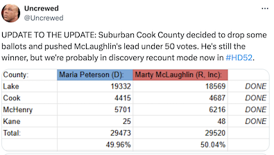 I think the Presidential numbers represent the ceiling for any ILGOP statewide hopefuls in 2026. Barring something unforeseen and epic, hard to see any ILGOP out-performing Trump.