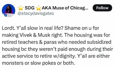She did not respond to a request for comment from the Tribune. But she did apologize for the comment on X.