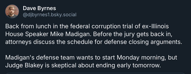 * Tribune | Feds in Madigan trial continue to lay out ‘corrupt exchange’ between ex-speaker and ComEd: In continuing to lay out the government’s evidence in her closing argument to jurors, Assistant U.S. Attorney Julia Schwartz played a wiretapped recording where then-ComEd CEO Anne Pramaggiore told Madigan’s longtime confidant and co-defendant, Michael McClain just how valuable the speaker’s influence had been.