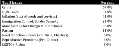 o 67% say crime is Chicago’s biggest issue, outpacing high taxes (54%) and inflation (41%).