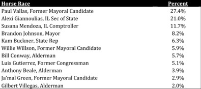 o Issues like LGBTQ+ rights (3%) and reproductive freedoms (4%) rank among the lowest priorities.2. Paul Vallas and Alexi Giannoulias Lead Early Mayoral Preferences
