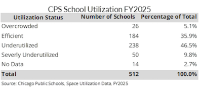 The following table lists the utilization status of CPS schools based on FY2025 Space Utilization Data. Based on CPS’ definition, underutilized schools are those at 70% or less of capacity. Severely underutilized schools are classified here as those at 33% or less capacity. See CPS’ interactive map of schools by utilization here to see these schools’ geographic distribution.