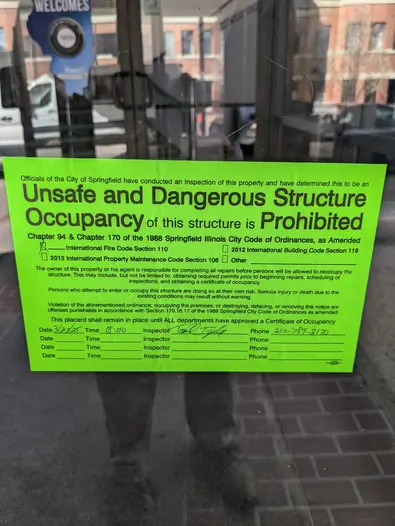 Springfield Fire Chief Ed Canny told WCIA Friday the hotel does not have functioning sprinklers, fire alarms or elevators. While employees are allowed to work inside, no guests are currently allowed to stay overnight.