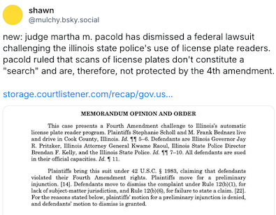 This lawsuit was against the state police. Their alpr’s are on the interstates so it’s pretty tough to know where people go from there.