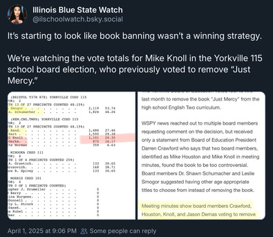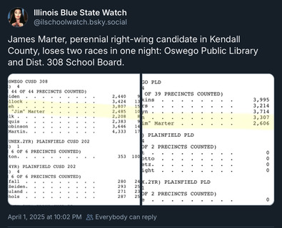 * PJ Star | ‘Deeply honored’: Two challengers and incumbent win seats on Dunlap school board: Incumbent Tom Feldman successfully defended his seat, while challengers Youssef Boudjarane and Mick Hall defeated incumbents Abby Humbles and Steven Hodel. Key subplots in the race were a campaign by a group of parents calling for the removal of current school board president Humbles and the circulation of mailers by a political action committee targeting Hall that highlighted a three-year suspension of his law license in 2012.