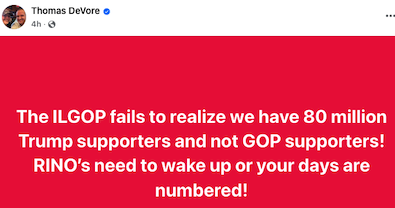 It is comforting to hear Ives, Proft, and DeVore explain the problem. Wasn’t it last year when DeVore insisted he is not a Republican? How does that work, Mr. DeVore? You ran as a Republican, then lost, then declared you are not a Republican, and now you are wanting the Republican Party to become like more like you - Republican. Geez.