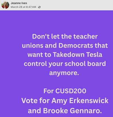 “The other guy hates Tesla” is a really unusual position to be running on for school board. Aside from it really having nothing to do with school board or local elections (Unless Tesla is building a factory here, which Musk won’t do because we value workers rights here) from a messaging standpoint it is still several degrees removed from things voters might be familiar with.