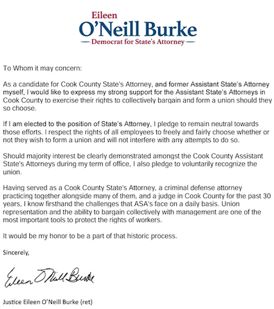 “State’s Attorney Burke supports organized labor and the right of workers to collectively bargain, including ASAs once Illinois law allows for it. Decades of binding case law must be addressed for that to happen, however, and as the county’s chief law enforcement officer and a former judge, she has taken an oath repeatedly to uphold the law. Our office looks forward to working with the appropriate stakeholders to get this right.” — Matt McGrath, CCSAO spokesman