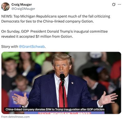 * By the way, Gotion is represented by the Mercury lobbying outfit. President Trump’s former campaign manager and current chief of staff Susie Wiles was until recently the co-chair of the Mercury lobbying group. Mercury lobbies for Gotion in both DC and Illinois.