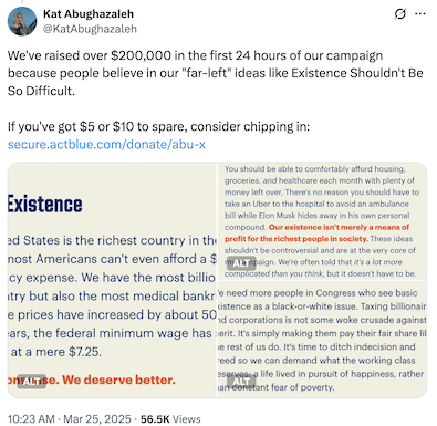 This post’s weird non sequitur attacking Abughazaleh is a pretty good example of why Democrats are struggling to make the tent bigger.