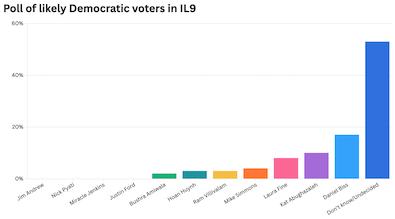 I’m not sure that this can be called a three-way race at this point? It looks like there are two clear frontrunners (Biss and Abughazaleh) and a bunch of obscure state legislators who are floundering in the single digits?