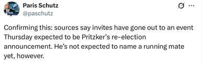 * WGN | Pritzker to announce reelection bid Thursday: sources: Pritzker has reportedly scheduled multiple campaign-style events this Thursday to kick off his third run for governor. The next gubernatorial election in Illinois is November 3, 2026.