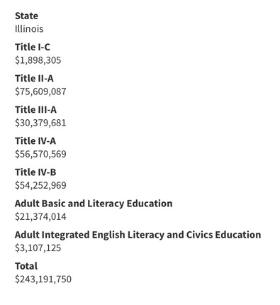 * According to Education Week, Illinois will lose over $240 million in funding. The first list explains what the funding is for…