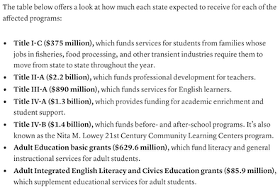 The money being held back also includes $2.2 billion in Title II funds that support teacher training, $1.4 billion for before- and after-school programs, and $1.3 billion in funding for academic enrichment programs, such as STEM and college and career counseling. […]