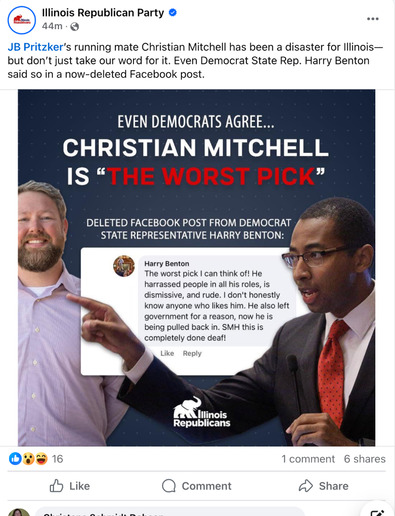 Yesterday, JB Pritzker introduced Illinois families to Christian Mitchell – a former do-nothing, corrupt State Representative. Mitchell’s rubber-stamp approval for higher taxes, corruption, both as a state representative and confidant of convicted felon Mike Madigan, are further proof that the Democrat Machine continues full-steam ahead while putting big-donors and special interests first. But don’t just take it from us; take it from Democrat State Representative Harry Benton in a now-deleted Facebook post: