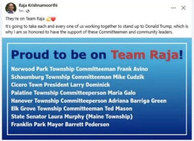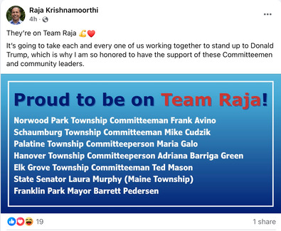 Yup, Raja endorsed by Larry Dominick, who the taxpayers have paid massive amounts to settle sexual harassment lawsuits against, and who recently openly supported the death penalty. Seems on point. And also interesting that Raja posted that endorsement, only shortly after to pull it down and re-release suburban committeeperson endorsements without his name. What does he have to hide?