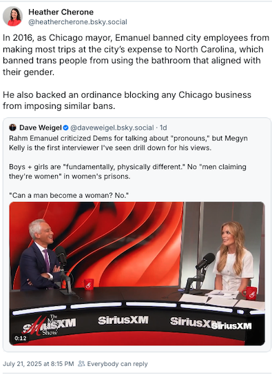 Rahm is not going to die on the transgender hill. When only 20% of the population favors men in women’s sports, political reality starts to creep in.