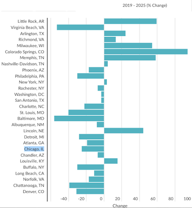 In the cities studied, homicides were down 17 percent from July of last year through the end of June this year. Homicides decreased nationally by 14 percent from July of 2019 through June of 2025. So, Chicago is about double the decreases in the other states.