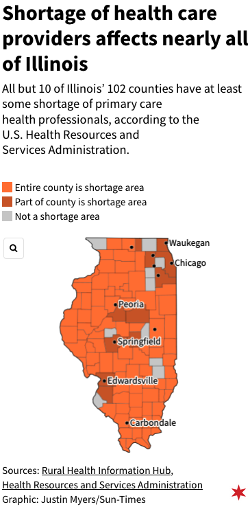 The Migration Policy Institute predicts the state will be short 6,200 doctors by 2030. Meanwhile, over 12,000 Illinois residents have an international medical degree they can’t use, according to Upwardly Global, an organization that helps immigrant and refugee professionals find work in the U.S.