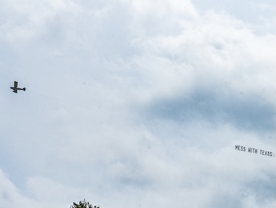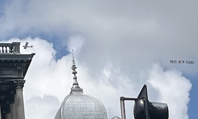 * An airplane is circling the Statehouse Complex while towing a banner that reads “Mess With Texas.” Not a great pic, don’t know who paid for it, but here you go…