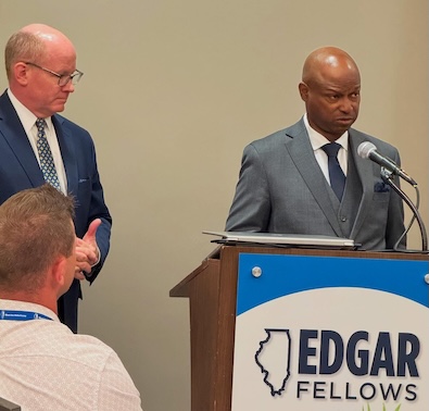 It was an honor to join Senate President Don Harmon for a joint presentation on leadership today at the annual Edgar Fellows gathering in Champaign. This bi-partisan group of leaders is a great cohort, and they will be a big part of the Edgar Fellows legacy in the years ahead. pic.twitter.com/cnLzv8TLgb