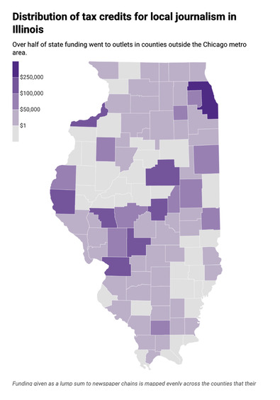 The legislation attempted to cap the amount of funding to organizations backed by private funds like Gannett and Alden. One such company, Lee Enterprises, still managed to be the largest recipient of Illinois’ tax credits at $375,000 across applications it submitted for four newspapers in the state.