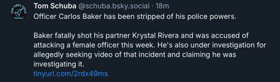 As soon as Baker is relieved of his service weapon and his police powers and fired, there is a somewhat better chance that whistle blowers will come forward. Right now the memory of what happened to Krystal is fresh and must feel threatening to anyone who might want to come forward and help flesh out the story.