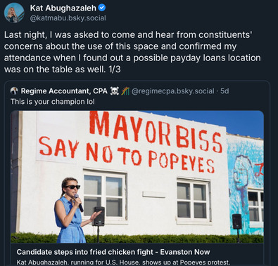 Abughazaleh is doing an excellent job of proving every single one of her detractors correct. She was called an unserious carpetbagger by foes when she first announced, and here she is fighting over a Popeyes in a local zoning/development fight just because the mayor of the city is one of her opponents.