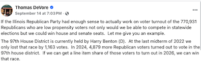 For reasons unknown IL GOPies in recent years have stopped ignoring morons like DeVore. Perhaps they should return to that tradition especially since most of the their moneyied ( perhaps not a word) morons have fled the state.