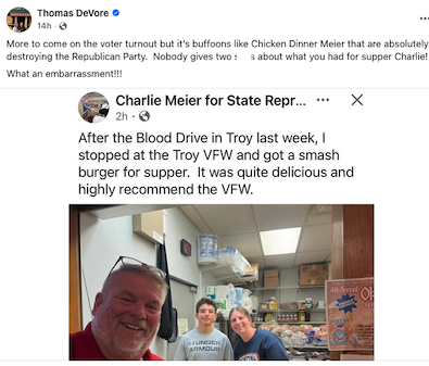 Charlie is not only praising a local business but a VFW. Evidently DeVore has a problem with local electeds highlighting such establishments.