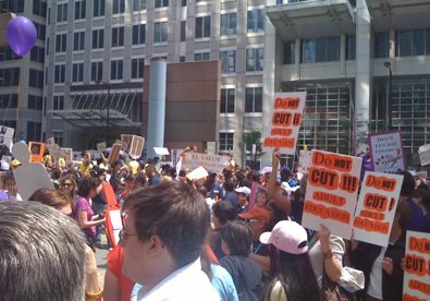 * 12:31 pm - There’s a protest against the budget cuts at the Thompson Center today. Here’s a pic and OneMan is live-Tweeting the event…