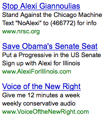 * And whilst we’re on the subject of the Intertubes, I was searching Google News for stories on Mark Kirk’s US Senate race this morning and noticed these Google ads on the right side of the page…