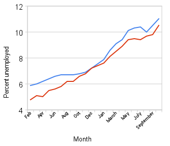 Progress Illinois has a chart showing how Illinois’ unemployment has tracked with the national rate. Ours is higher, but fairly consistent with national trends…
