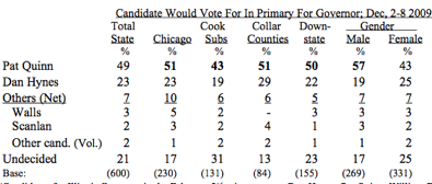 Among the 600 likely Democratic primary voters surveyed by telephone Dec. 2-8, Quinn had the support of 49 percent to 23 percent for Hynes, the three-term comptroller. Among other candidates, activist William “Dock” Walls had 3 percent, and attorney Ed Scanlan had 2 percent. An additional 21 percent were undecided; 2 were for others. The poll has an error margin of 4 percentage points.