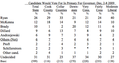 The race has been pretty much static since Jim Ryan declared his intentions. Dillard’s TV blitz during the Tribune’s polling period didn’t help at all. Maybe the voters will change their minds come the big (and, don’t forget, very crowded) January hoo-ha, but unless somebody’s message really catches fire, this is Ryan’s race to lose.