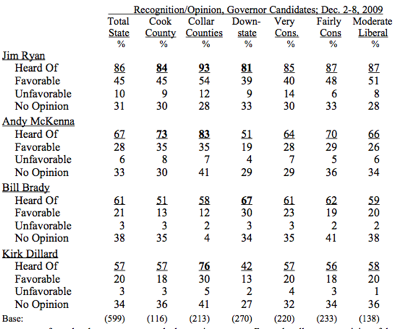 VanMan has an interesting observation. The polls do seem to give the impression that the Blago years may have put everyone to sleep. As the voters are waking up, the poll numbers just hop back to the name ID that one might have expected at the beginning of the decade.