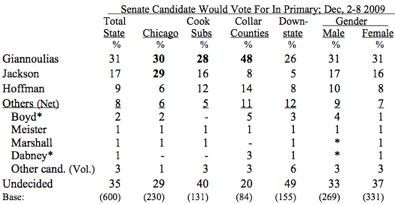 Giannoulias’ strongest geographic support came from collar-county primary voters, 48 percent of whom backed his bid compared with 14 percent for Hoffman and 8 percent for Jackson. Among Chicago voters, Giannoulias and Jackson were virtually tied at around 30 percent support, while the treasurer held a 28 percent to 16 percent edge over Jackson in the Cook County suburbs, where 40 percent of voters said they were undecided.