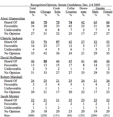 Jackson is doing significantly better in the Tribune poll than in any of the other surveys. Hoffman is about the same. After getting a bump in November, Giannoulias is about the same.