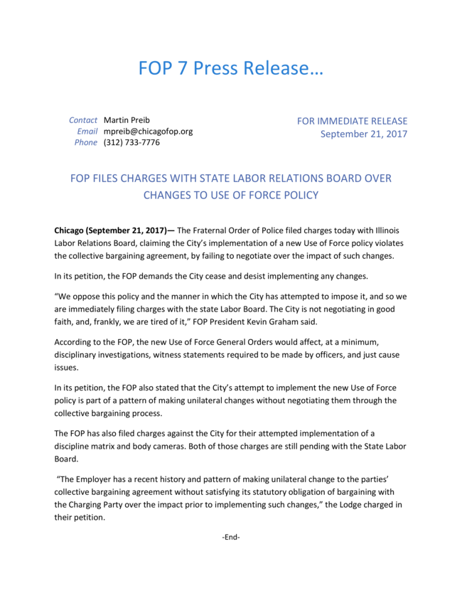 “We oppose this policy and the manner in which the City has attempted to impose it, and so we are immediately filing charges with the state Labor Board. The City is not negotiating in good faith, and, frankly, we are tired of it,” FOP President Kevin Graham said in a statement.