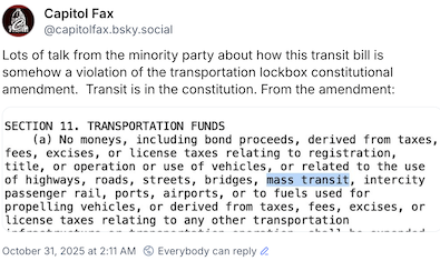 * Crain’s | Illinois lawmakers bring forth latest plan to overhaul Chicago-area public transit as deadline looms: Legislators are considering a last-minute $1.5 billion transit-rescue package that will rely mainly on transportation-related revenue sources. The potential deal, which also includes a steep increase in highway tolls, was hammered out during late-night negotiations that carried into today on the final day of the fall veto session, but still faces the hurdle of being approved by both the House and Senate. The deal would authorize over $860 million from a motor fuel sales tax. Theannual interest that is generated from the state’s road fund would also flow towards mass transit. The revenue split from the motor fuel sales tax would be 85% to the Chicago region and 15% to downstate transit. The road fund interest would be a 90% to 10% split. * Tribune | Illinois lawmakers bring forth latest plan to overhaul Chicago-area public transit as deadline looms: During the hearing Thursday evening, the proposed measure faced pushback from lawmakers who suggested the bill would fund Chicago-area transit at the expense of downstate infrastructure. Opponents also expressed frustration that they were asked to debate the proposal without a version of the bill ready to read. … The bill introduced Thursday would hike tolls collected by the Illinois State Toll Highway Authority for commercial and passenger vehicles. It would increase the tolls for commercial vehicles by 30% and raise the toll for passenger cars by about 45 cents per toll. The revenue from the toll hike would generate between $750 million and $1 billion annually and be put back into the tollway and not be used directly for mass transit. But the move was intended to offset the money being diverted from highway projects and appeared to have won the blessing of the International Union of Operating Engineers Local 150, which opposed a springtime effort to use a toll hike to fund transit. * Sun-Times | Illinois Democrats wrangle over ways to pay for $1.5B legislative package to buoy mass transit: But some downstate representatives said the amended bill took them by surprise, that it doesn’t allocate enough money outside of the Chicago area, and that the bill should be held for another day. * CNI | Latest Chicago transit funding plan appears to avoid statewide tax increases: Downstate lawmakers in both parties worried they drew the short straw in the bill, however, as only $129 million would go toward operational expenses at downstate public transit agencies. The agencies and advocates hoped to receive $200 million. “This is a devastating and extensive change for the district I represent,” Rep. Ryan Spain, R-Peoria, said. The downstate lawmakers also worried the bill tapping into Road Fund money removed a critical funding source for road construction projects. Illinois AFL-CIO President Tim Drea, who led a coalition of labor unions in negotiations over the bill, spoke in support of the proposal on Thursday. Unions have typically fiercely opposed any measure that diverts from the Road Fund but support this measure because of its importance to union employees at transit agencies. * Homeowners’ insurance reform passed the Senate and then unexpectedly failed in the House, even after an internal roll call was taken…