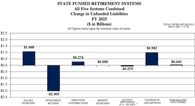 However, the increase in the unfunded liability was largely offset by $2.005 billion in actuarial investment gains, resulting in a modest net increase. As mentioned earlier, all five systems experienced actuarial investment gains in FY 2025, with TRS accounting for $1.519 billion (76%) of the total.