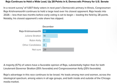* Raja Krishnamoorthi’s campaign has dropped a new poll. There are still lots of undecided voters… Polling was conducted online from December 4-8, 2025. Drawn from a list of past Democratic primary voters and using Dynamic Online Sampling and SMS text messaging to attain a representative sample, Change Research polled 1,007 potential Democratic primary voters in Illinois. Post-stratification was performed on age, gender, race/ethnicity, education, and region. The survey has a margin of error of 3.2 percentage points. * Politico…