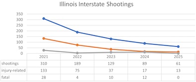 Since the post-pandemic spike of 2021, there has been a decrease in interstate shootings every year: