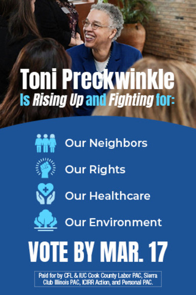 * Legal Newsline | Court shoots down bid by IL judges to undo Tier 2 pension reforms: On March 5, a three-member panel of Illinois state appellate court justices turned aside the bid by Cook County Judge Natasha Toller and retired St. Clair County Judge Patricia Kievlan to overturn limitations on judges’ pensions enacted in Illinois’ so-called Tier 2 pension reform law. In the ruling, the appeals panel said the judges’ claims against the Tier 2 law fell short because they became judges after the law took effect, and can’t now try to escape the terms and limits in place when they essentially signed the contracts governing their pension benefits. * Illinois Review | After Illinois Review Story, AM 560 Quietly Deletes Social Media Attacks on Conservative Gov. Candidate Darren Bailey: The criticism was not just about tone – it was about conflicts of interest. Two of the station’s most prominent hosts, Dan Proft and former state Rep. Jeanne Ives, are also senior political advisors to the gubernatorial campaign of Ted Dabrowski, Bailey’s opponent in the Republican primary. To many conservatives, that raised serious questions about whether AM 560 had allowed its media platform to be used as a political weapon. * Center Square | With teachers union support, committee approves charter school mandates: State Sen. Celina Villanueva, D-Chicago, told the Illinois Senate Executive Committee on Wednesday she has been working on Senate Bill 3391 for a couple of years. The Chicago Teachers Union supports the legislation. CTU Legislative Director Hilario Dominguez said Chicago Public Schools spent about $35 million stabilizing failed charter operators. “This legislation simply ensures that when organizations receive public funds to educate our children, they are accountable to the public,” Dominguez told the committee. * Bloomberg | City defers big slice of bond sale as Mideast conflict upends yields: Chicago put off the sale of about $292 million in tax-exempt bonds the city planned to sell this week as conflict in the Middle East rattles global markets. The debt was a part of an $800 million package that the city had scheduled to price on Tuesday, according to bond filings. Chicago proceeded to price the $511.9 million taxable general obligation bond portion of the deal. The tax-exempt bonds will price at an undetermined future date, Chicago Acting Chief Financial Officer Steven Mahr said in an email. The city currently expects to return to the market to sell general obligation bonds in the second and third quarters of 2026 but it may speed up or postpone those transactions based on factors including market conditions, he added. * WBEZ | CPS should work to prevent future attendance drops due to immigration enforcement, community groups say: A coalition of community groups and a parent advocacy organization are urging Chicago Public Schools to take steps now to prevent attendance declines should there be another surge in federal immigration enforcement. Among the things they are asking for: More frequent updates about attendance trends and designated safe spaces where students and parents can retreat should they encounter a threat while going to or from school. * ABC Chicago | Trump Tower in Chicago makes improvements after failing health inspection: In December, a health inspector cited the downtown Chicago hotel for six issues, including flies in the bar and dish areas, and improper storage of cold food. They were instructed to have all areas affected by pests checked out by an expert. The hotel later passed inspection on December 23rd. * Block Club | How 7 Families Celebrate The South Side Irish Parade, From Breakfast With Politicos To A Backyard Mass: The breakfast usually brings in a number of politicians who are going to be in the parade. Gov. JB Pritzker, Sen. Dick Durbin and Rep. Sean Casten have all attended — as did Barack Obama years before he ran for president. Jack Kelly is a member of the parade committee, and Maureen Kelly said her family often jokes that the day is “better than Christmas.” * NBC Chicago | Suburban school district uses license plate readers to verify student residency: According to the school district, her daughter’s new student enrollment form was denied due to “license plate recognition software showing only Chicago addresses overnight” in July and August. In an email sent to Sánchez in August, the school district told her, “Although you are the owner on record of a house in our district boundaries, your license plate recognition shows that is not the place where you reside.” Sánchez is adamant she and her daughter have been steadily living in their home since moving in. As for the location of her car—she says she loaned it to a family member in Chicago last summer. Now it’s back in her driveway. * Press release: Personal PAC, the Chicago Federation of Labor, Sierra Club Illinois, and ICIRR Action teamed up through their political organizations to run joint ads supporting Toni Preckwinkle ahead of the March 17 primary. This coalition, activated in the wake of Trump’s Inauguration, has also been a driving force behind the large-scale “No Kings” rallies and the Hands Off Chicago coalition. This group will continue to find ways to support one another and join together with other advocacy groups to protect Chicago, fight for our values, and support elected leaders who can deliver real progress. ![]() * WTTW | Group of Cook County Leaders Seek Special Prosecutor, Claim Eileen O’Neill Burke ‘Abandoned’ Duties to Investigate ICE: That coalition, which includes more than 200 elected officials, community organizations, attorneys and religious leaders on Thursday filed a petition in Cook County court after they said State’s Attorney Eileen O’Neill Burke has failed to hold federal agents accountable. “Absent such (an) appointment, the message to federal agents operating in Cook County would remain clear: you may shoot unarme