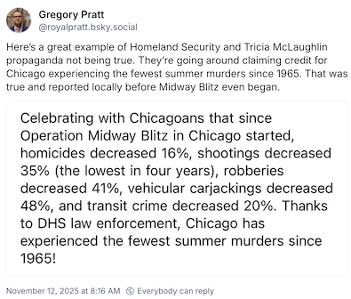 “Never attack Chicago in the winter,” is a snarky slogan I’ve seen online since the story broke. Gov. Pritzker jokingly called Bovino a “snowflake” yesterday. * However, if Bovino & Co. return in early March, that could be right before the state primary election. And if his next incursion is as disruptive to everyday lives as his latest, then Democratic candidates who have tried to downplay or at least not play up the storm could very well be at a disadvantage. …Adding… The whole bunch of them just isn’t a reliable information source… Operation Midway Blitz started September 9th.